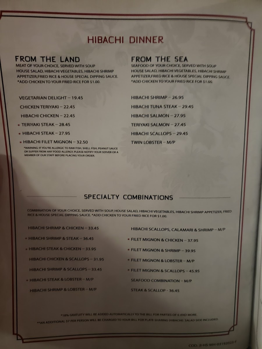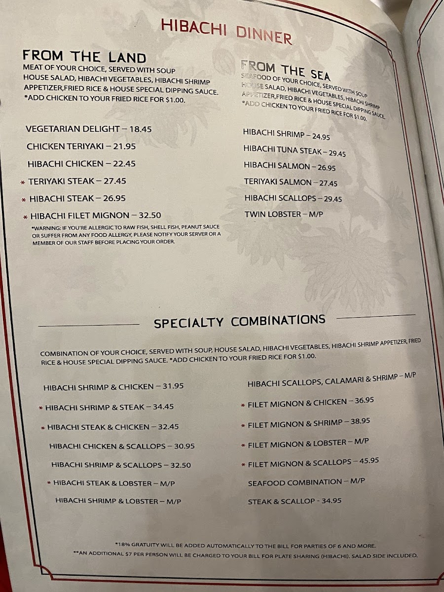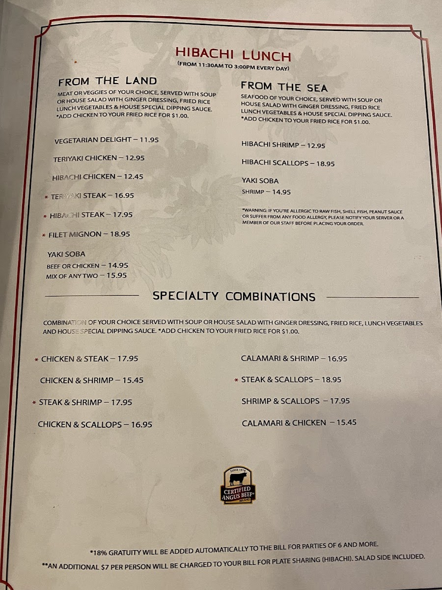 Veggie, steak, chicken, or shrimp. Served with clear soup, miso soup, salad, or none.