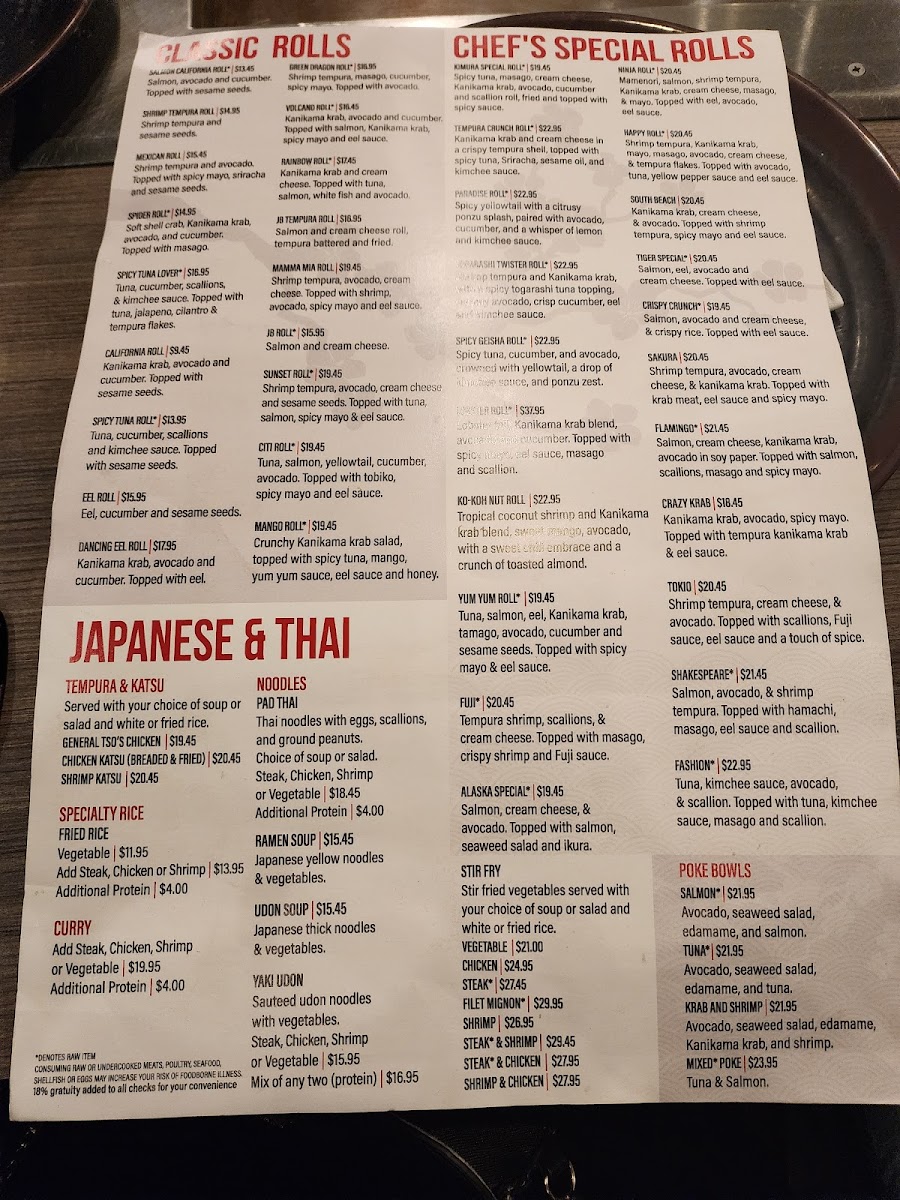 5 pieces of sashimi and your choice of roll: California Roll, Tuna California Roll, Spicy Tuna Roll, JB Roll, Salmon California Roll, Shrimp Tempura Roll, or Eel Roll. Served with soup or salad.